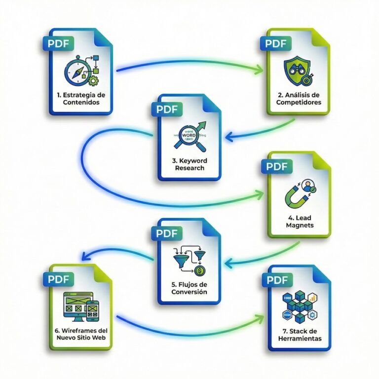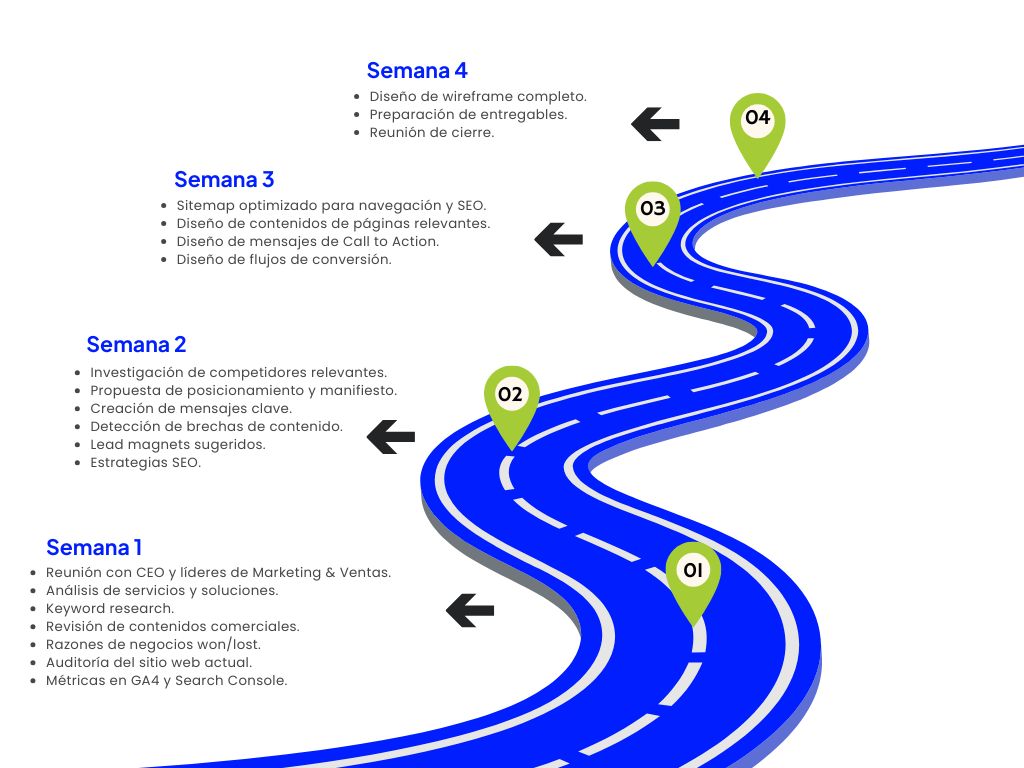 Se trata de un plan maestro de tu sitio: define arquitectura, mensajes, contenidos y flujos de conversión para que el diseño y desarrollo se construyan con estrategia y no por intuición.