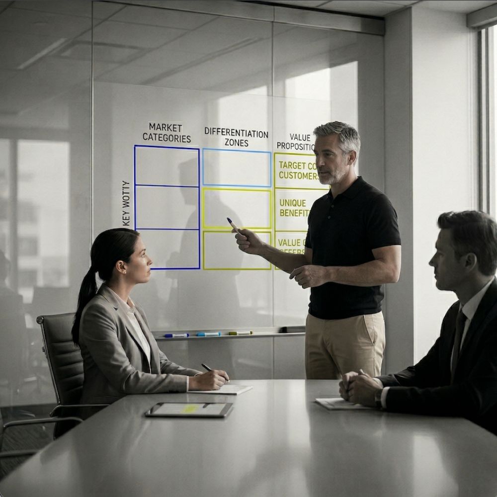 Beneficio: proceso estructurado basado en el método de April Dunford, validado en startups y empresas globales. Valor: posicionamiento "a prueba de balas" que elimina la ambigüedad y aumenta la efectividad comercial.